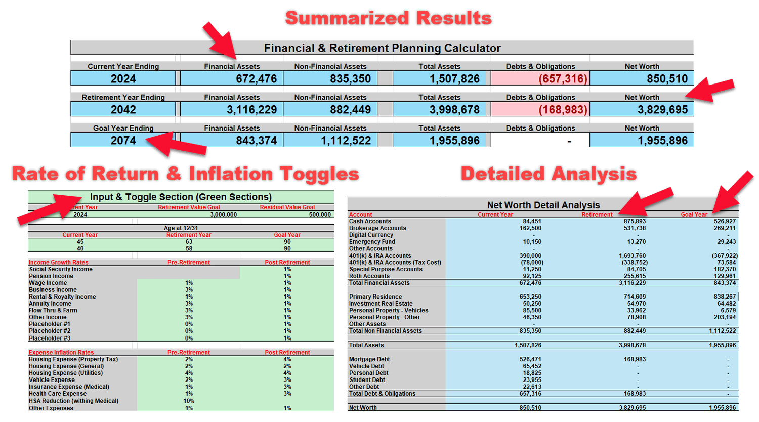In the Financial & Retirement Planning Calculator program, we will focus on the sources of our income, how it will grow over time, where it will be allocated for personal expenses, education expenses, health-related expenses, income deferrals and more, with the ultimate goal of figuring out when we can retire, how our finances will look during retirement, and ultimately what we can reasonably expect to leave to our posterity.
